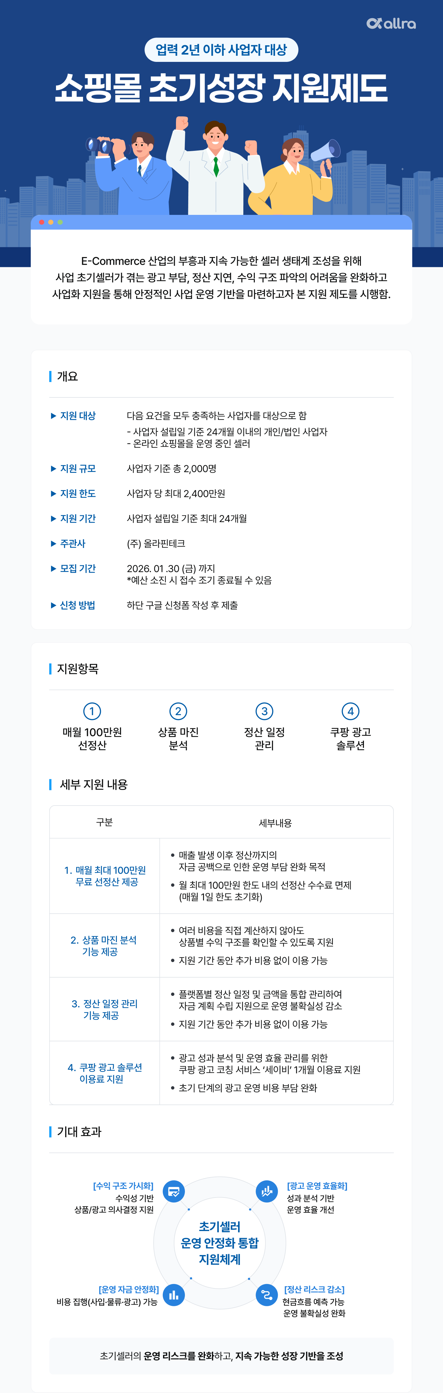 해당 지원 사업은 사업 초기 단계의 이커머스 셀러가 겪는 광고비 부담, 정산 지연, 수익 구조 파악의 어려움을 완화하기 위해 마련된 「초기 성장 지원 사업」입니다.