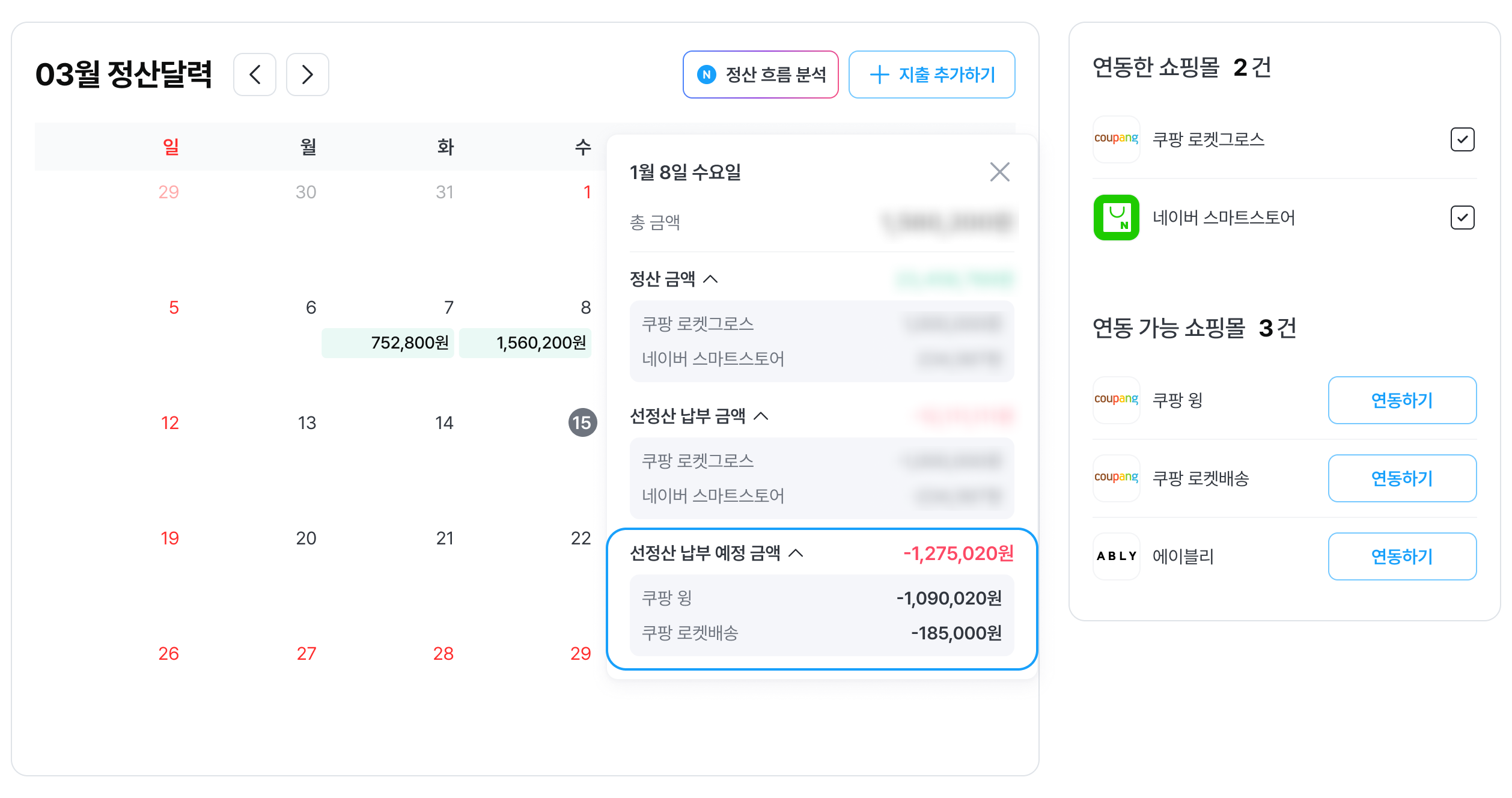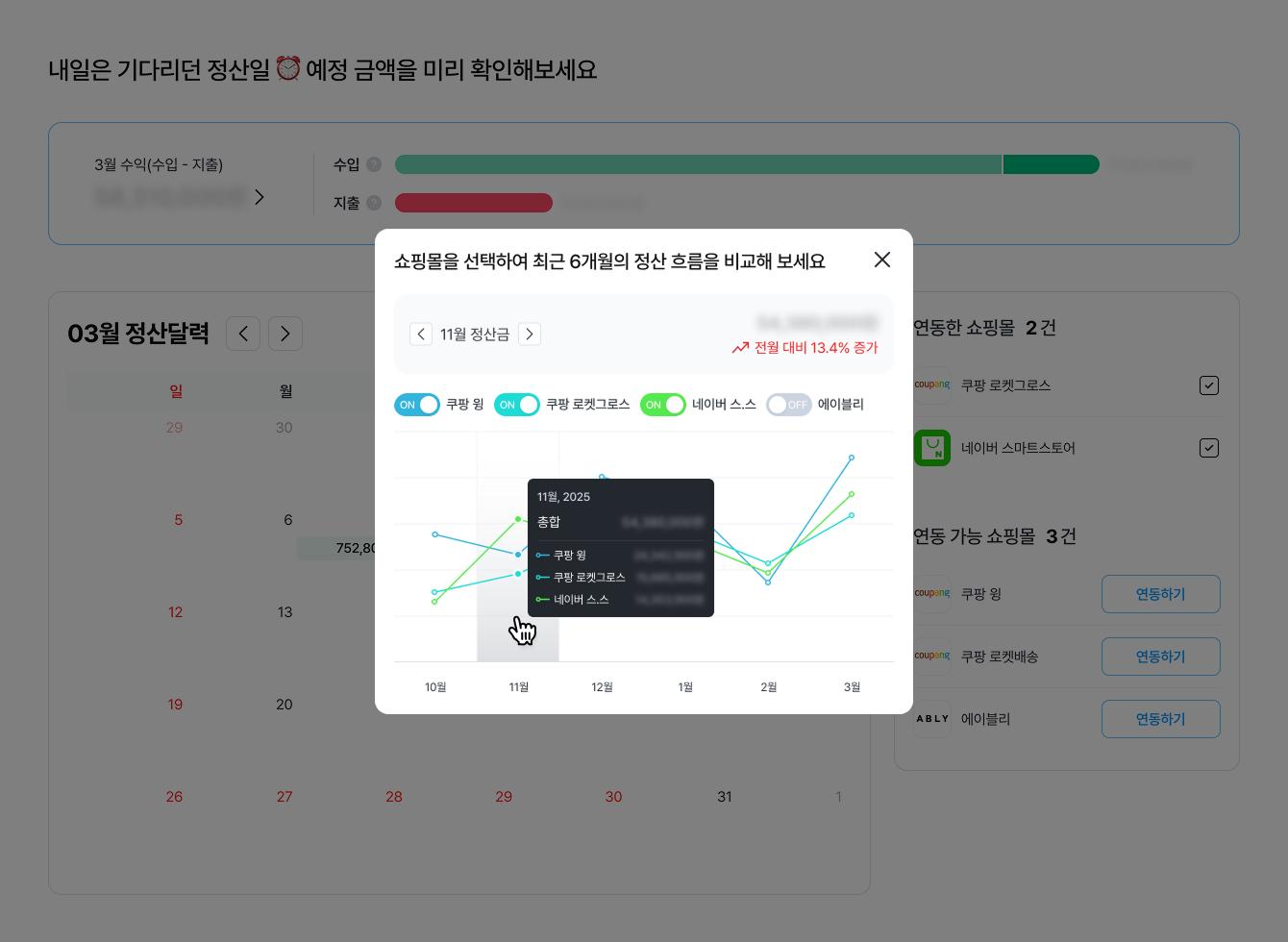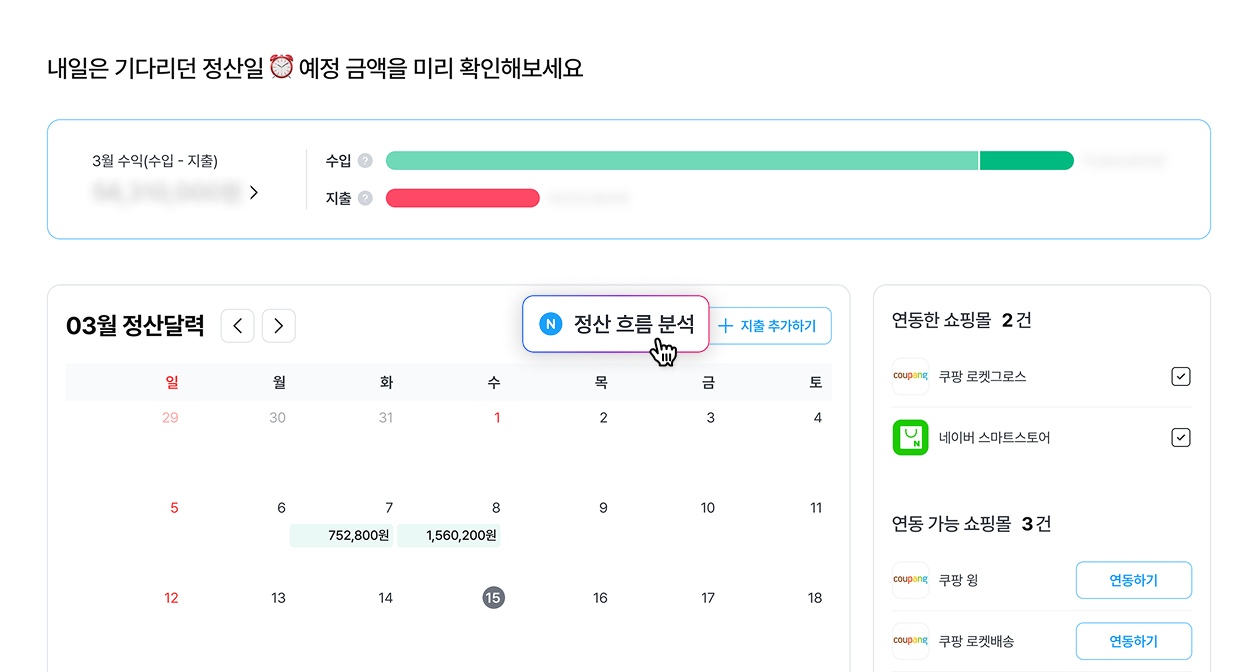 단 30초 쇼핑몰 연동으로 사장님만의 정산달력을 바로 확인해보세요! (무료 이용 가능)